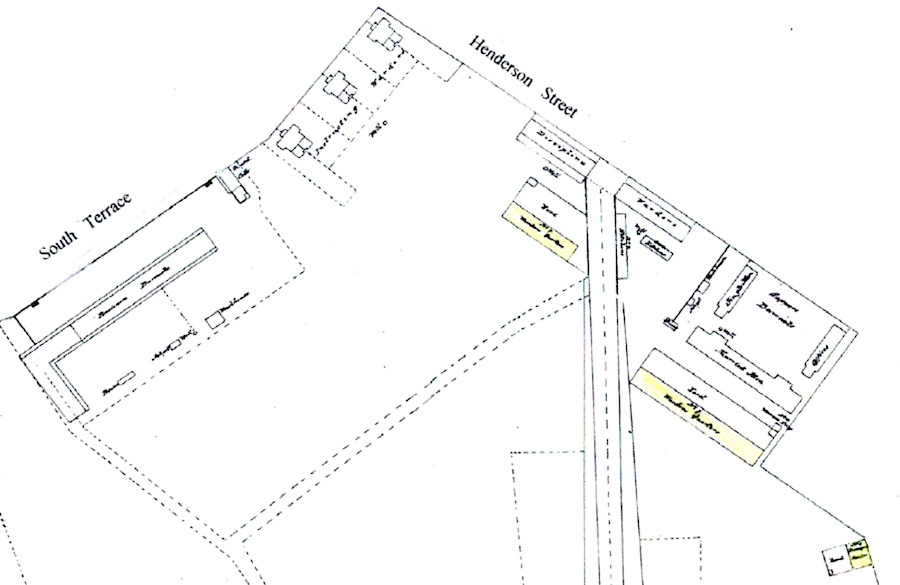 The Barracks (on the left in the map above) housed the Enrolled Pensioner Force. The building was in South Terrace from 1853 until some time in the 1950s, and was built to house the ex-soldiers who were assigned to guard the convicts on ships when transportation started in 1850. It 'was a two-storey terrace of thirty-two units each of two rooms, with communal facilities - cook-house, wash-house, and "the necessaries" - out in the back yard'. (Campbell 2017: 13)