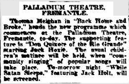 PALLADIUM THEATRE FREMANTLE. Thomas Meighan in "Back Home and Broke," heads the new programme which commences at the Palladium Theatre, Fremantle today. The supporting feature is "Don Quixote of the Rio Grande" starring Jack Hoxie. The usual children's matinee will be held, when "community singing" of popular songs will take place. Tomorrow night "While Satan Sleeps," featuring Jack Holt, will be screened. The West Australian [Perth], Saturday 6 October 1923: 12 Notes. Back Home and Broke, a comedy, was released in the USA in December 1922. The Jack Hoxie film is, according to IMDb, entitled Don Quickshot of the Rio Grande. It is, as its title suggests, a western. It was released 4 June 1923, so the print got to Fremantle quite quickly. While Satan Sleeps sounds to be an unfortunate title to screen on a Sunday: it is another western. |