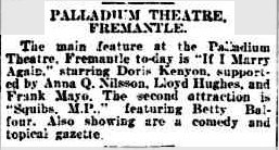 PALLADIUM THEATRE FREMANTLE. The main feature at the Palladium Theatre, Fremantle to-day is "If I Marry Again," starring Doris Kenyon, supported by Anna Q. Nilsson, Lloyd Hughes, and Frank Mayo. The second attraction is "Squibs M.P.," featuring Betty Balfour. Also showing are a comedy and topical gazette. The West Australian [Perth], Saturday 26 August 1925: 11 Notes. If I Marry Again is a drama that was released in Feb 1925. Here's a plot summary from IMDb. |