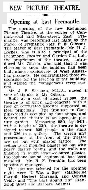 The opening of the new Richmond Picture Theatre, at the corner of Canning-road and Silas-street, East Fremantle, was performed last night by the Mayor of Fremantle (Mr. F. E. Gibson). The Mayor of East Fremantle (Mr. H. J. Locke), who is also a principal of the Richmond Theatre and Garden Co., Ltd., the proprietors of the theatre, introduced Mr. Gibson, who said that it was cheering to know the building had been built almost exclusively of West Australian products. He congratulated those responsible for the erection of the building, and wished the management every success.