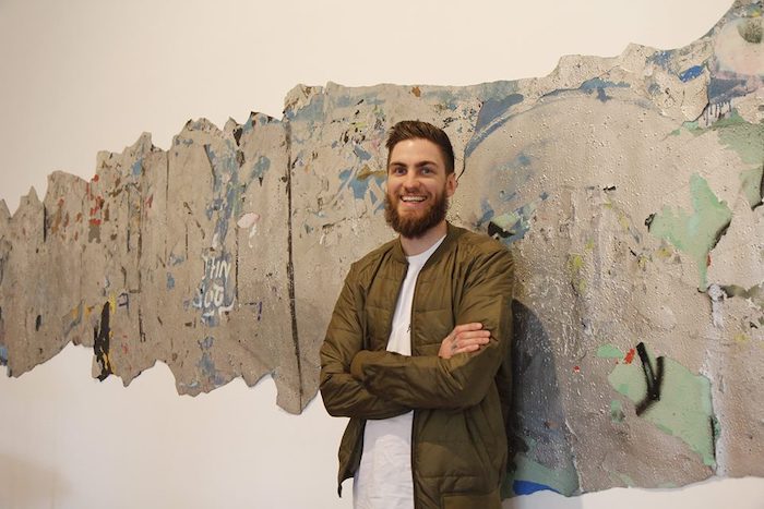 Sam Bloor with his First Prize award-winning work. Bloor’s relief print In Unison was chiseled from a graffiti-covered wall and represents a 15 year history of this space.