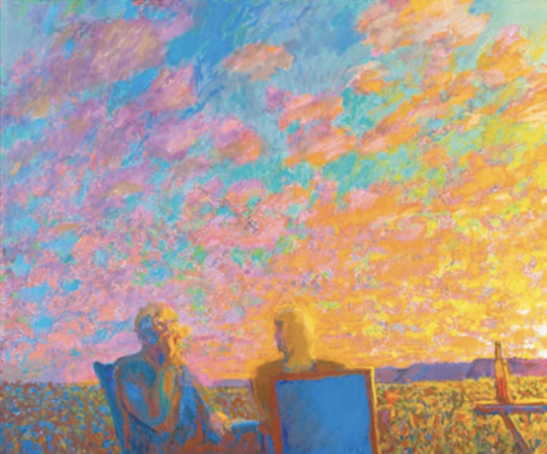 His work is reminiscent of the vibrant colours employed by David Hockney in the 1960s, but with a more dreamy, soft-focus touch.