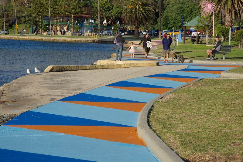 Perhaps WA’s longest artwork and one of AC4CA’s most ambitious projects to date, a 500-metre walkable geometric painted pathway will unfold in November, tracing the shoreline of the Derbarl Yerrigan to connect Fremantle’s two bridges.