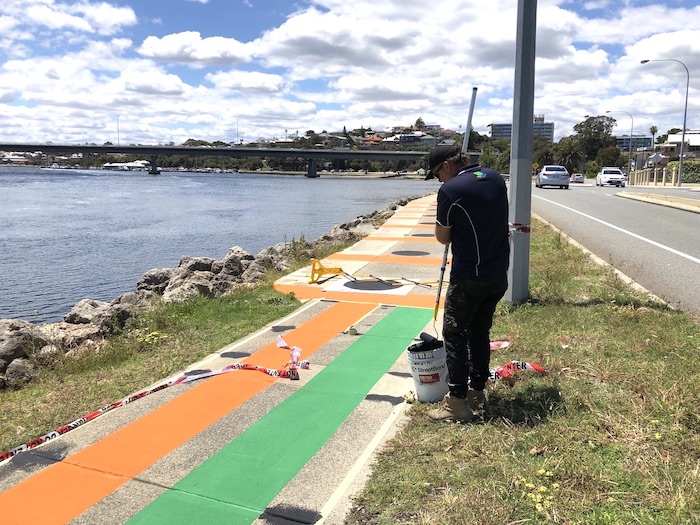 Artwork/Artwalk in progress, 28 October 2021. The paint used is StreetBond SB 150. It is non-slip and permanent. It 'had to be' permanent in case toxins in the paint leached into the river in heavy rains.