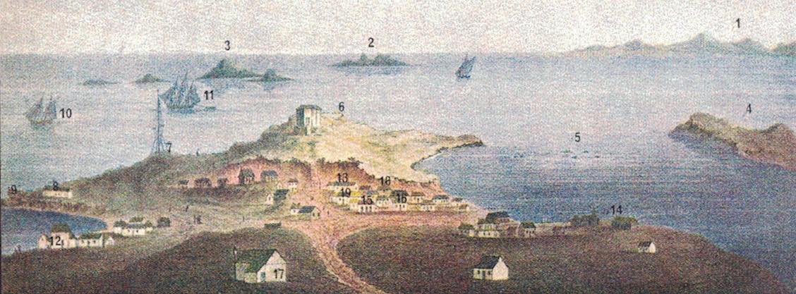 Wallace Bickley, ‘View of Fremantle, Western Australia (from the Canning Road)’ with prominent features numbered (AGWA). Samson’s post office in Mouat Street (#18), Dr Harrison’s house (#17) and the Stirling Arms Hotel (#15) are three of the prominent buildings identified in Wallace Bickley’s painting, published in London September 1832. The painting also shows the limestone bar blocking entry to the Swan River estuary (#5).