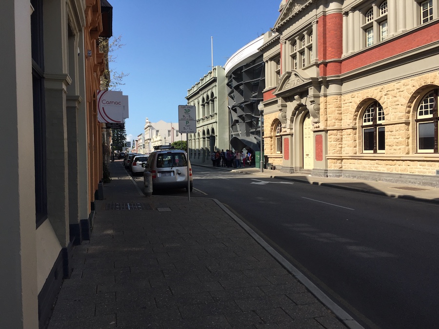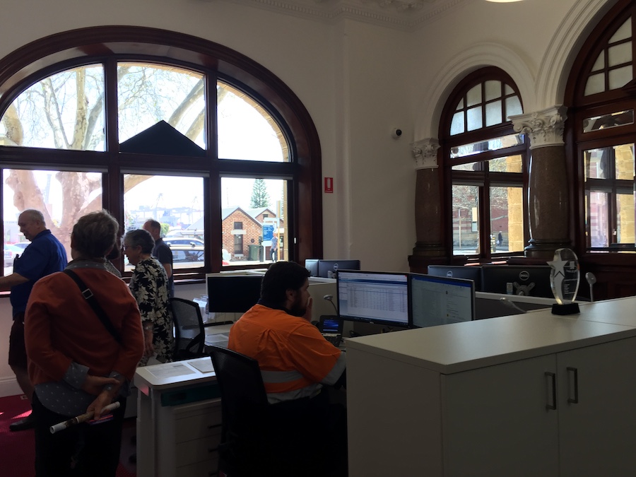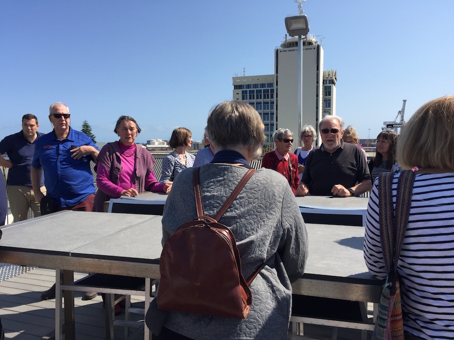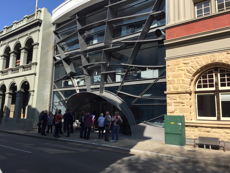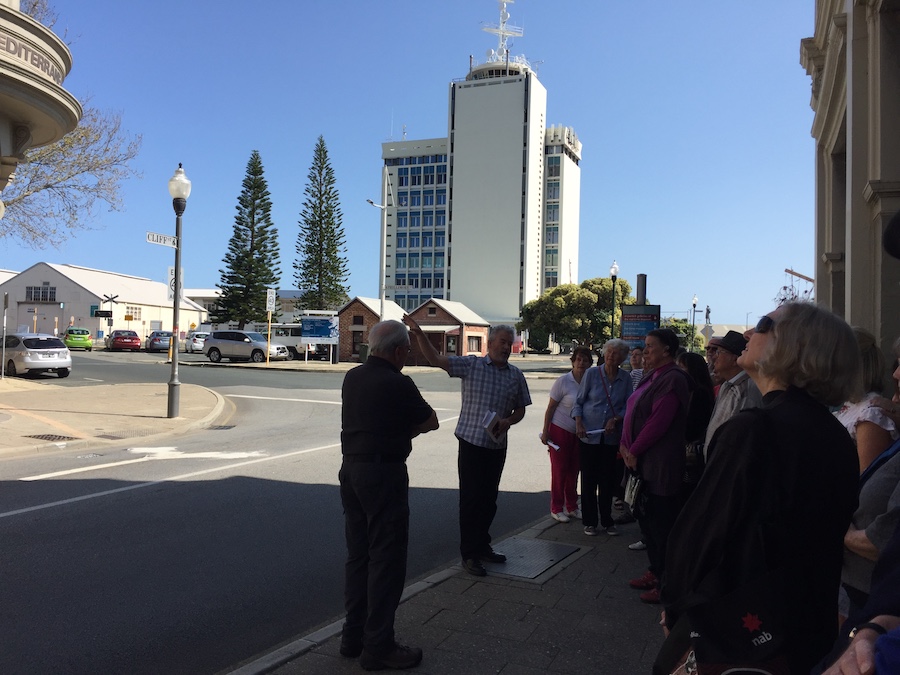 After a few minutes inside, we were ushered out again for some reason, to hear some introductory stuff we could have heard better inside, as the traffic was quite busy in Cliff Street on a Saturday morning. Also we all had to cross the road twice. That's Stuart Neal addressing the group with the Fremantle Ports building in the background.