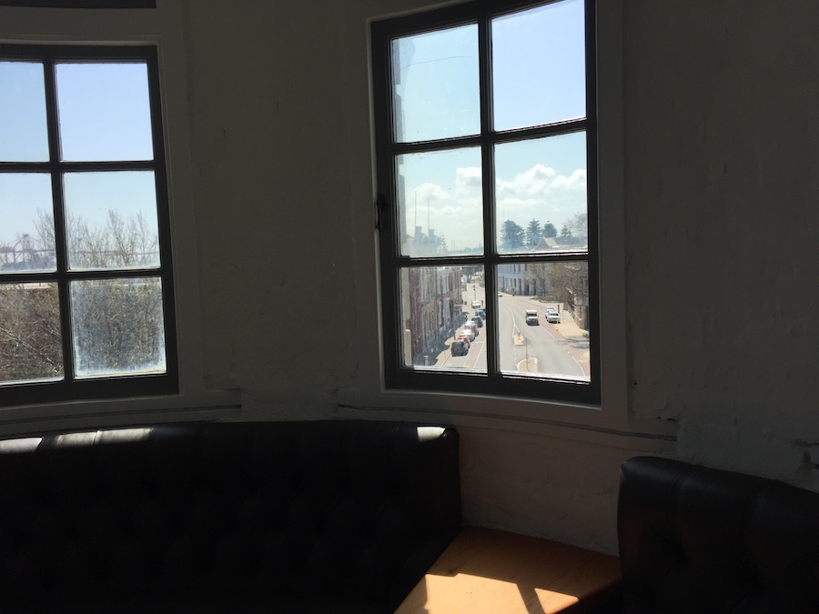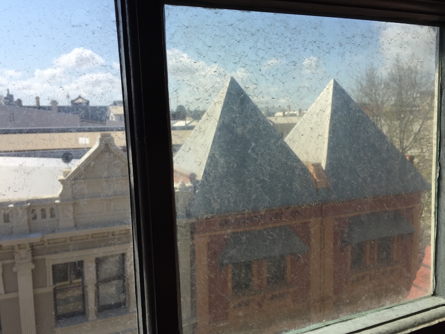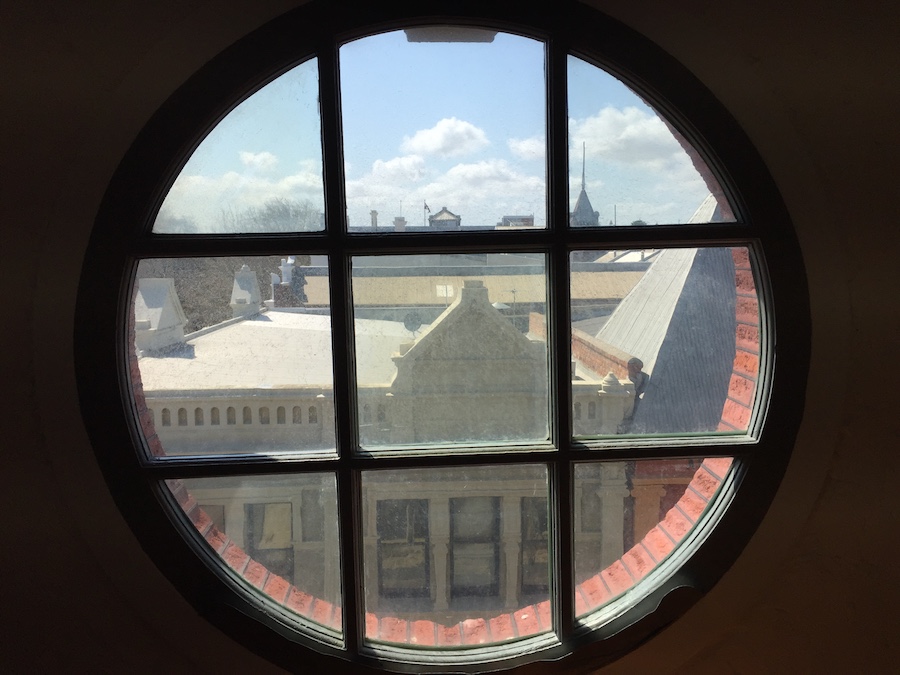 And, in the third of the meeting areas, the second round window, looking east this time. That's the German consulate (Tarantella's - at 5 Mouat Street) spire in the top right corner. The flag is the one always flying on the top of Steamship Buildings.