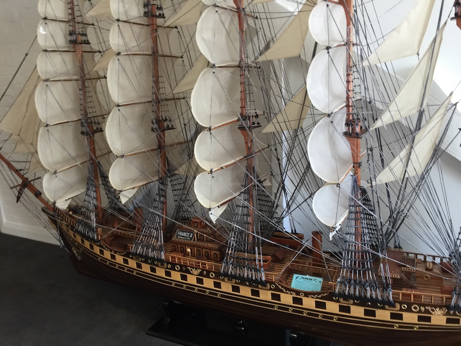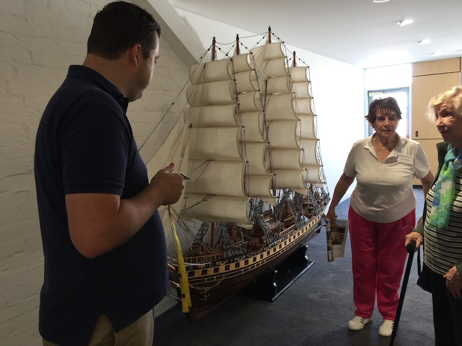 MSC manager James Granville showing a model sailing ship to committee-member Fay Campbell, and another visitor.