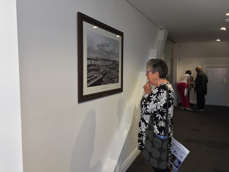 Ruth Belben looking at an old photo of the port. The building has a large number of old and new photos and also new artworks. There is also a J.J. Talbot Hobbs 'gallery' - it's a corridor - with photos of some of his buildings.
