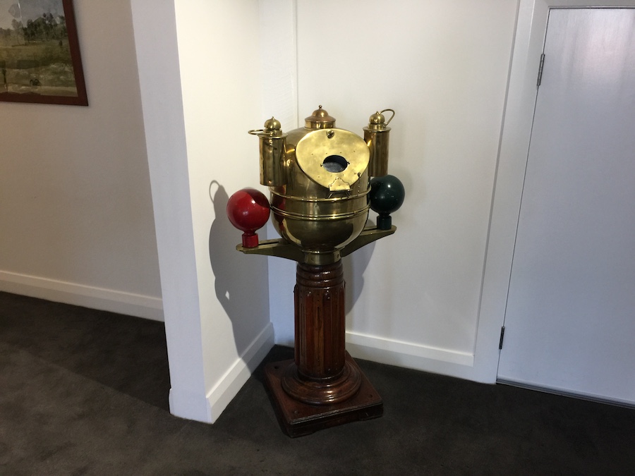This is a binnacle. I should have looked through the window. I might have seen a compass. The 'Kelvin's balls' on either side are iron correcting spheres.