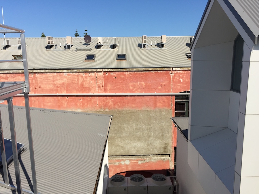 Looking west, over the air-conditioning units towards the back wall of the former Dalgety's Warehouse and Bond Store, 1901, the first building from the west in both Phillimore and High Streets (1 Phillimore becomes 2 High St). It would also be considered to be in Little High Street, as the entrances to the apartments are on that side, so has three street addresses. Elder Smith owned it from 1927 until Lionel Samson bought it in 1971. In 1983 it was sold and later converted into apartments: those are their aircon units you can see on the roof.