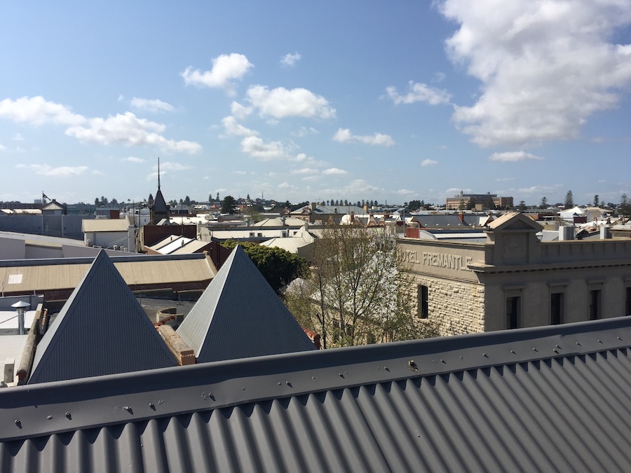 Looking a bit south of east to show one corner of Fremantle Hotel, with the hospital in the distance.
