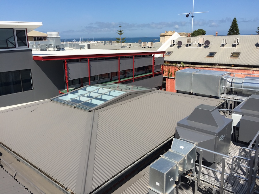 Looking southwest from the roof terrace, see again the air-conditioning plant, and a glimpse of a bit of the Round House in the distance.