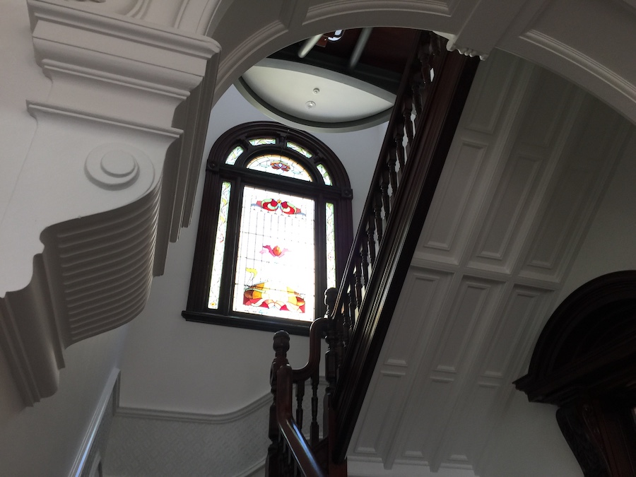 Staircase just inside from the main chamber. That's the only stained glass I can remember seeing in the building.