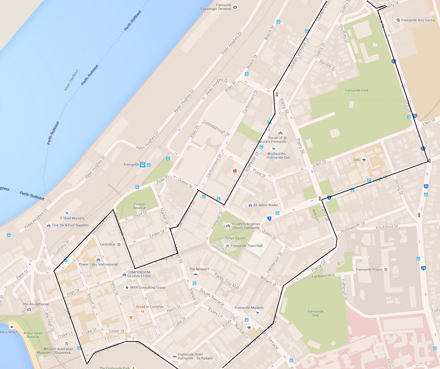 The tour starts and finishes at the Asylum (Fremantle Arts Centre) entrance. Click on the map for a larger version.