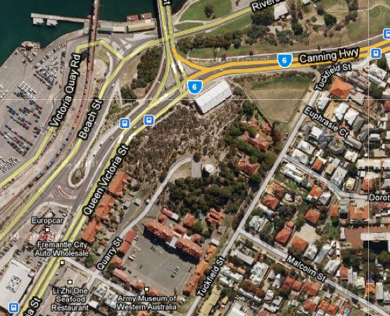 This is Google Maps' [thank you] view from above, showing Cantonment Hill in relation to the river, etc. Most of the piece of land you can see between Queen Victoria St and Tuckfield St was held by the Federal Defence Dept - including the green bit near the top which is called Tuckfield 'Oval' (though it's triangular). Some of it - the scrubby-looking parts - are now held by the City of Fremantle. The Army Museum - in the former Barracks at the bottom of the picture - will continue as such. The houses along Queen Victoria St, known as the Gunners Cottages aka Married Quarters, have been renovated (2016). One of the houses on the opposite corner of the site has been alienated and is now private housing for some lucky family.