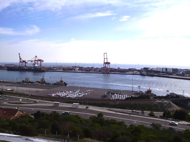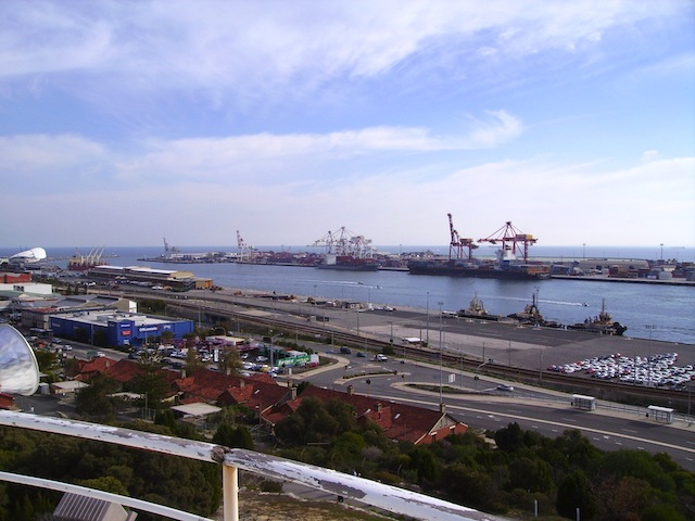 The middle of the Port of Fremantle. Containers are unloaded on the North Wharf, while vehicles come off the ships tied up to the Victoria Quay (the southern wharf) because there is somewhere for them to stand until they are driven to dealers to be sold. That area is now fenced off - with serious razor wire - so punters like me can no longer walk along that part of the southern wharf.