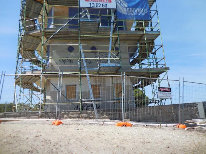 The Signal Station in early 2016. The scaffolding has since been removed. The fence has also been removed, tho the gate on the road is still padlocked.