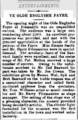 The opening night of the Olde Englishe Fayre at Fremantle was an unqualified success. The audience was a large one, numbering about 2,000. An excellent programme was provided and met with the greatest appreciation at the hands of the patrons of the Fayre. Miss Emmie Smith and Mr Harry Fitzmaurice were in special demand. The acrobatic feats of the Bauvard family were excellent and the coster songs of Mr Pat Melton received a large number of encores. Owing to the unfortunate accident to Mr. Ted Bauvard his part was taken by Mr. Joe Cowan. The exhibition given by Messrs. Wal., Syd. and Bert Bauvard on the treble trapeze was of a sensational character and called forth unstinted applause from the spectators Mr. Tom Williams acted as music conductor and Mr. Harry Fitzmaurice as stage manager. The setting of the stage was of a pleasing character, the scenery provided being decidedly artistic. The electric light furnished for the occasion was the first installation in the town and worked satisfactorily.