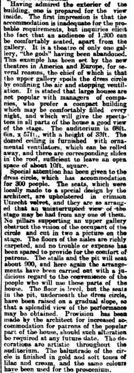 The building, which is in the renaissance style of architecture, has a neatly designed, but not extravagantly ornamented facade. There are six beautiful pedestal lamps, which were lighted on Saturday night, furnishing a brilliant illumination. A feature of the exterior of the structure is the unroofed promenade, 12ft. wide and 200ft. long, extending the full length of the property, and corresponding with the handsome balcony of the Freemasons' Hotel. A row of five shops in the front of the building should be exceedingly useful for revenue purposes. There are three spacious entrances to the theatre, the dress circle door being in the centre. This opens on to an attractive granolithic staircase leading above to the vestibule, off which are large and convenient cloak-rooms for ladies and gentlemen. Recently Mr. George Musgrove visited the theatre, and when he passed through these rooms he remarked that they were as good, if not better, than anything he had seen in London. On the opposite side