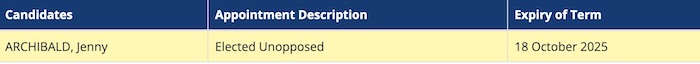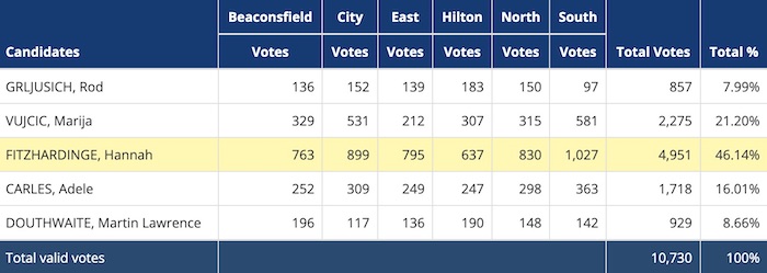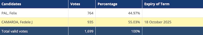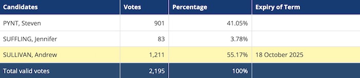 Postal voting closed 1800 Saturday 16 October, with the result announced before midnight.