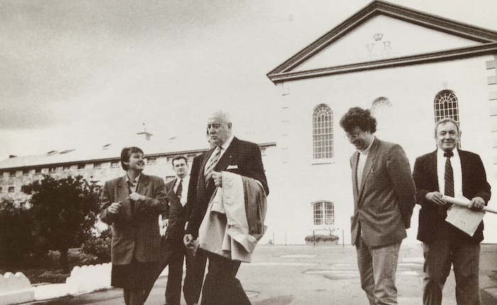 Ralph Hoare's presidency gets off to a good start in 1994 when Society Patron Gough Whitlam visits Fremantle Prison. Also at the scene are former Society president Mayor Jenny Arhibald and Society Vice-President Ron Davidson. [Fremantle Herald]