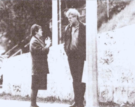 Mayor Jenny Archibald and architect Brian Klopper seeking a compromise about the Dockers changerooms, 1994. [Fremantle Herald/Michael Wearne]