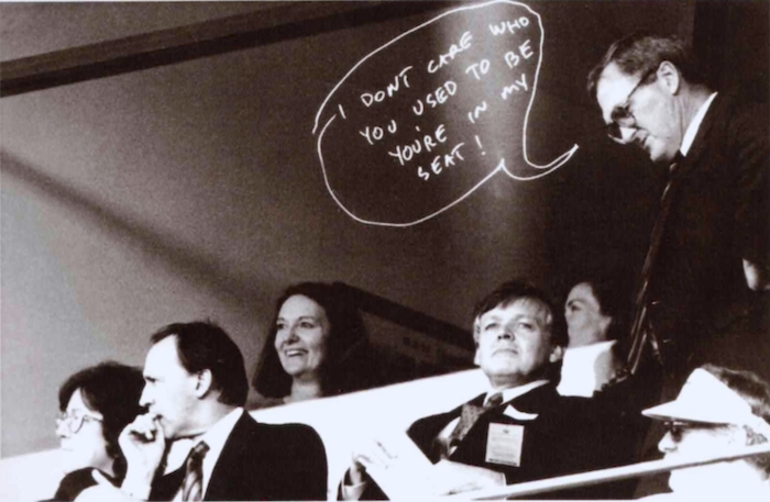The Fremantle Society aften did not see eye to eye with the University of Notre Dame. However, it did when UND Vice-Chancellor Peter Tannock strongly attacked the ING proposal. Here Carmen Lawrence, Paul Keating and John Dawkins provide Dr Tannock with the setting for a Herald staffer's speech balloon. [Fremantle Herald]