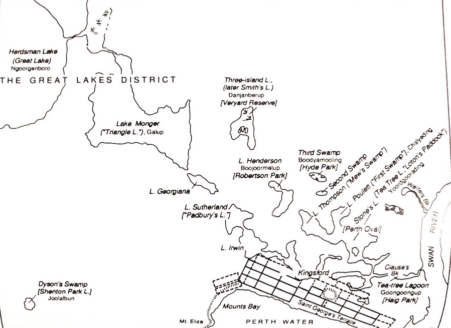Fig. 1. Perth Lakes about 1830, at the end of the rainy season. The map is based on the Arrowsmith map of 1833, adapted by Margaret Pitt Morison, as first published in Western Towns & Buildings (M. Pitt Morison & J. White, eds., 1979), p. 14. Water surfaces would have shrunk considerably by the end of summer. The lakes' alternative names have been added, and land allotments omitted. [Tap/click for larger size.]
