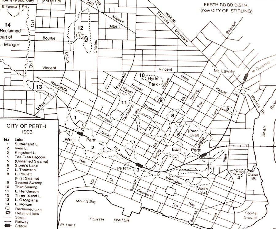 This article attempts an historical reconstruction of the transformation and almost complete obliteration of what used to be an intriguing, very significant and, for some people, embarrassing element of Perth’s landscapes, namely the many small lakes, basin swamps and marshes situated ‘at the back’ of the town. As the town expanded, some of these lakes were drained or filled and further lakes were reached. Gradually and fortunately, concepts of urban planning had in the meantime evolved towards a better understanding of the natural environment. Thus the ‘outer’ lakes—a few to the west, many north of the town and many south of the river—were preserved, albeit with almost unavoidable interference. They will not be examined here.