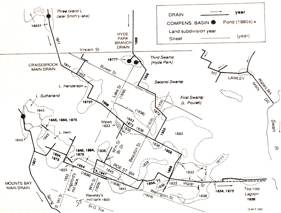 The Mounts Bay Drain, draining Lake Monger into the Swan River, was built in three sections, proceeding uphill: from the river to Wellington Street in 1907, Wellington Street to Sutherland Street in 1908, and Sutherland Street to Lake Monger in 1909. It now drains the areas originally covered by Lakes Sutherland and Georgiana (Fig. 1, and Nos 1 and 13 in Fig. 2). The Perth City Gasworks were built on the ‘public gardens’ just north of Claise Brook in 1914, and, in 1929, Tea-tree Lagoon was finally filled in. Its north bank was then used for industrial buildings. 41