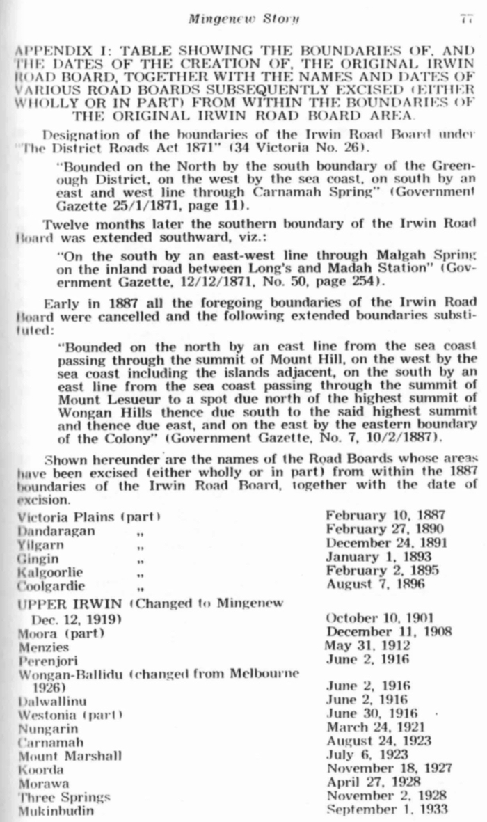 This monograph's theme must now concentrate its si>otlight upon the Irwin Road Board and more particularly to one of the excisions, that of the Upper Irwin Road Board created in 1901. Before doing so it may be opportune here to record that the story of beginnings so far told is equally applicable to all the road boards listed in the Table 1 mentioned.