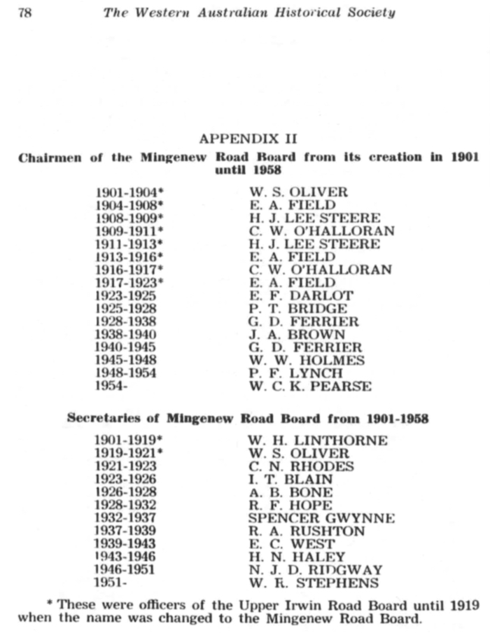 For a decade after its creation the town of Mingenew was, of course, within the territory of the Irwin Road Board, but no evidence has obtruded that the Board, which held its meetings at Don-gara, some forty miles to the westward, gave any attention to its requirements. One reason for this could have been that its site had not been proclaimed as a townsite.