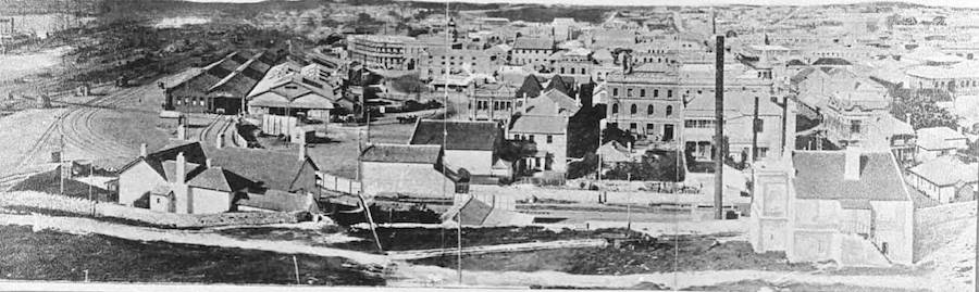 View from Arthur Head Lighthouse across the railway yars and eastward over the city, c. 1900. Courtesy Fremantle Local History Collection, 530