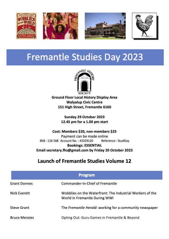 The Fremantle History Society Studies Day was held on October 29th in the Local History Display Area at the Walyalup Civic Centre, Fremantle. About 40 people attended the meeting.