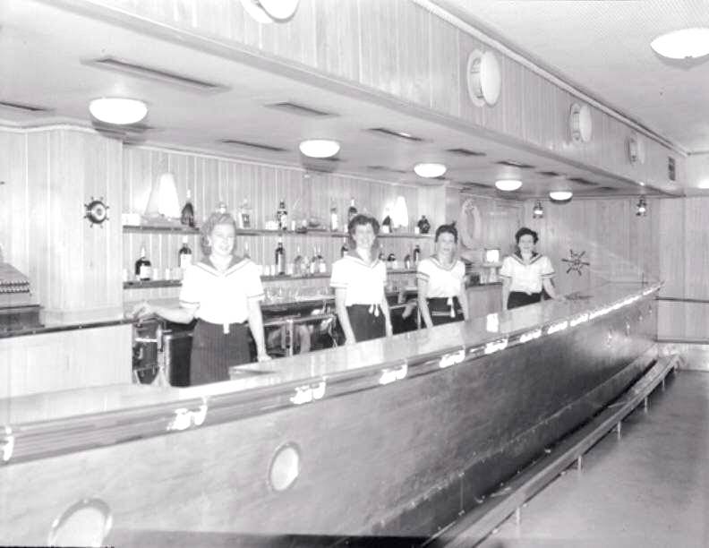 The next photo after the previous one. The girls on the left and right have not moved their hands. SLWA 103075PD, the saloon bar, 1955.