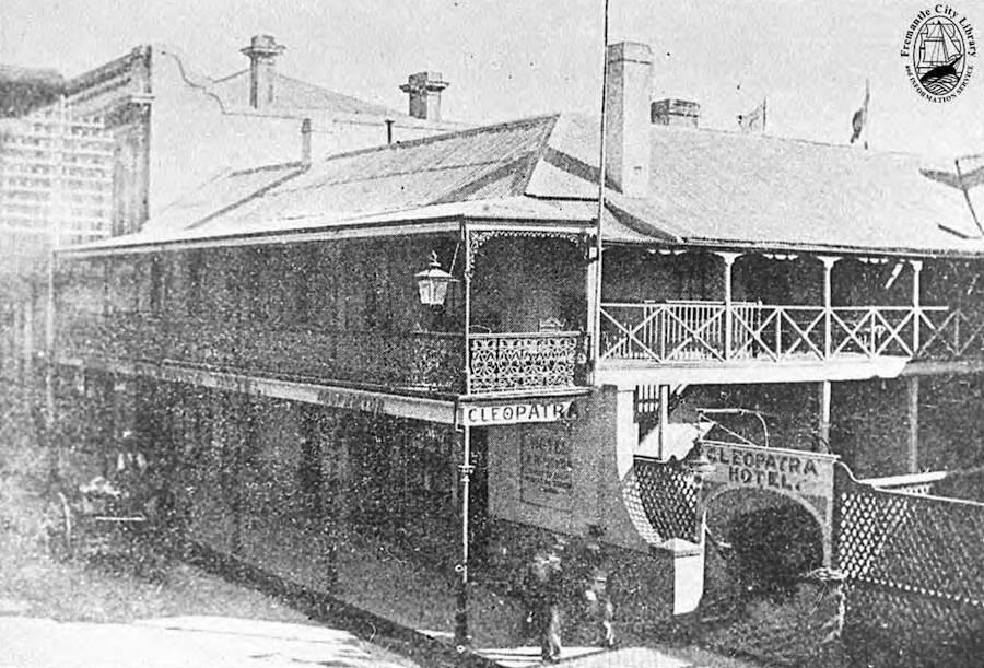 The hotel was originally called the Crown and Thistle. Captain E.H. Fothergill leased it from the owners Pearse and Owston in May 1881, renovated the premises and named them after the Cleopatra, a ship he owned. The hotel reopened 1st July 1881. It had an attractive garden and tile paved path and a sign (by Nicolay) showing the ship Cleopatra in full sail. Captain Fothergill remained proprietor until 1896. The building was demolished in 1906. Fremantle Library photo ref. 1024, c. 1890, and text.
