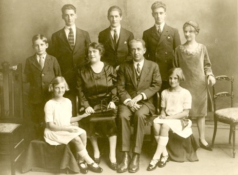 The Antoine family photographed in 1926. Standing at the back are Roger, Charles, Jean, Marcel and Edmée. Seated in front are Yvonne, Alice, Edmond and Odette. The photo was taken at Melba Studios, which was at 97-99 High St, the Bousfield building, and I think was Charles Nixon's business.