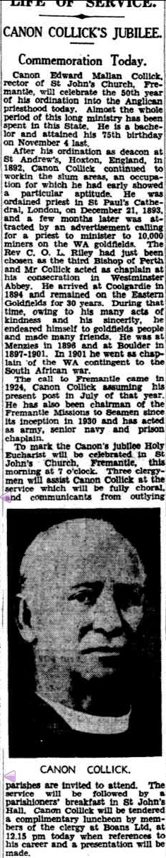 Canon Edward Mallan Collick, rector of St John's Church, Fremantle, will celebrate the 50th year of his ordination into the Anglican priesthood today. Almost the whole period of this long ministry has been spent in this State. He is a bachelor and attained his 75th birthday on November 4 last.