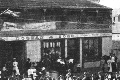 This photo from page 90 of Hitchcock of a reception for Governor Smith in 1896 shows Doonan's store on the left as the first building in Adelaide Street. The corner of the Town Hall is at the other extreme edge of Nixon's photo.
