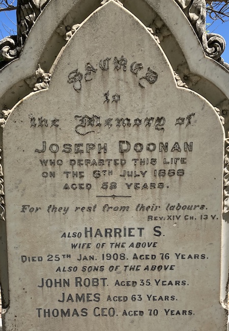 DOONAN, Joseph B. b. 1831 (Ireland), d. 8.7.1888 (Frem), arr. 13.1.1853 (with mother & sister) per Travancore, m. 18.7.1855 (C/E Frem) Harriet Sarah JACKMAN b. 1834 d. 15.1.1908. dtr. of Robert, she arr. as a servant with H.M.Lefroy's family 6.4.1854 per Sea Park. Chd. Thomas George b. 1856 d. 1928, James b. 1860 d. 1925, Mary Jane b. 1862, John Robert b.1865 d. 1901, Alfred b. 1867, Elizabeth Ann b. 1870. Was member of committee of Frem. Mechanics Inst. 1861. He bt. Town Lots in 1861, 1865 & 1868. Appointed Princ. Warder at the Convict Estab. 1863. Assistant Supt. 1873 & retired 1876 after the escape of the Fenian prisoners in the Catalpa. This event so preyed on his mind, he contemplated committing suicide. He was auditor of Frem. Town Council 1871. He owned drapery & grocery stores as well as a large house in Adelaide St. by 1880s. He employed a T/L man 1865 & 2 in 1B81. C/E.