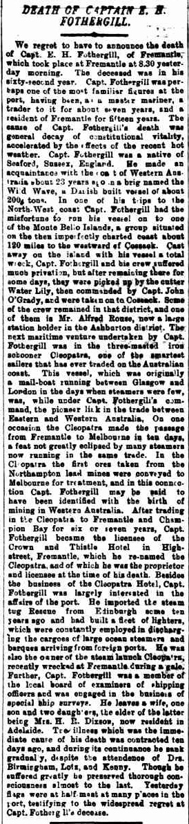 We regret to have to announce the death of Capt. E. H. Fothergill, of Fremantle, which took place at Fremantle at 8.30 yesterday morning. The deceased was in his sixty-second year. Capt. Fothergill was perhaps one of the most familiar figures at the port, having been, as a master mariner, a trader to it for about seven years, and a resident of Fremantle for fifteen years. The cause of Capt. Fothergill's death was general decay of constitutional vitality, accelerated by the effects of the recent hot weather. Capt. Fothergill was a native of Seaford, Sussex, England. He made an acquaintance with the coast of Western Australia about 23 years ago in a brig named the Wild Wave, a Danish built vessel of about 2000 tons. In one of his trips to the North-West coast Capt. Fothergill had the misfortune to run his vessel on to one of the Monte Bello Islands, a group situated on the then imperfectly charted coast about 120 miles to the westward of Cossack. Cast away on the island with his vessel a total wreck, Capt. Fothergill and his crew suffered much privation, but after remaining there for some days, they were picked up by the cutter Water Lily, then commanded by Capt. John O'Grady, and were taken on to Cossack. Some of the crew remained in that district, and one of them is Mr. Alfred Rouse; now a large station holder in the Ashburton district. The next maritime venture undertaken by Capt. Fothergill was in the three-masted iron schooner Cleopatra, one of the smartest sailers that has ever traded on the Australian coast. This vessel, which was originally a mail-boat running between Glasgow and London in the days when steamers were few, was, while under Capt. Fothergill's command, the pioneer link in the trade between Eastern and Western Australia. On one occasion the Cleopatra made the passage from Fremantle to Melbourne in ten days, a feat not greatly eclipsed by many steamers now running in the same trade. In the Cleopatra the first ores taken from the Northampton lead mines were conveyed to Melbourne for treatment, and in this connection Capt. Fothergill may be said to have been identified with the birth of mining in Western Australia. After trading in the Cleopatra to Fremantle and Champion Bay for six or seven years, Capt. Fothergill became the licensee of the Crown and Thistle Hotel in High street, Fremantle, which he re-named the Cleopatra, and of which he was the proprietor and licensee at the time of his death. Besides the business of the Cleopatra Hotel, Capt. Fothergill was largely interested in the affairs of the port. He imported the steam tug Rescue from Edinburgh some ten years ago and had built a fleet of lighters, which were constantly employed in discharging the cargoes of large ocean steamers and barques arriving from foreign ports. He was also the owner of the steam launch Cleopatra, recently wrecked at Fremantle during a gale. Further, Capt. Fothergill was a member of the local board of examiners of shipping officers and was engaged in the business of special ship surveys. He leaves a wife, one son and two daughters, the elder of the latter being Mrs. H. R. Dixson, now resident in Adelaide. The illness which was the immediate cause of his death was contracted ten days ago, and during its continuance he sank gradually, despite the attendence of Drs. Birmingham, Lots, and Kenny, Though he suffered greatly he preserved thorough consciousness almost to the last. Yesterday flags were at half mast at many places in the port, testifying to the widespread regret at Capt. Fothergill's decease. The West Australian, Monday 10 February 1896, page 3.