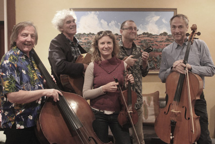 They are "The Sustainables" - Rick Martin (guitar vocals), John Reed (cittern vocals) Peter Grayling (cello), Rachel Armstrong (fiddle, vocals) and Gary Burke (double bass). They all play ukulele as well.