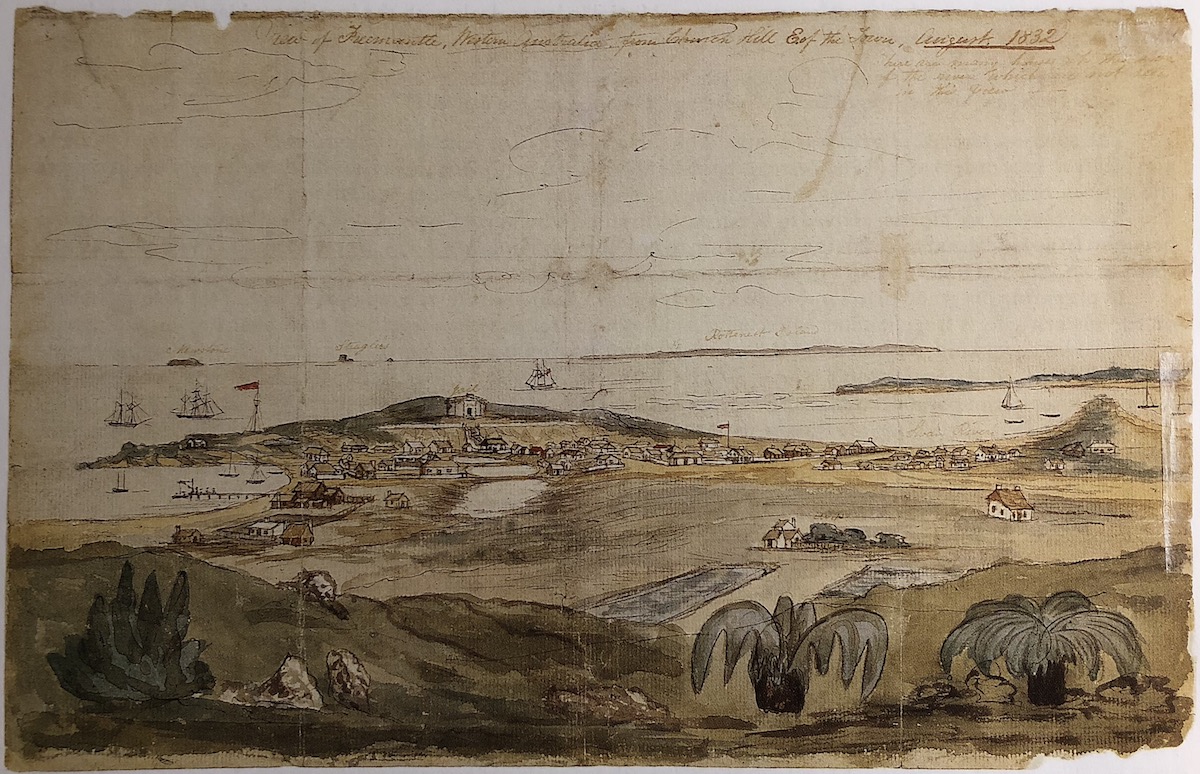 The sketcher, builder, farmer, postmaster and publican, was born in England on 29 January 1809, son of John Morrell, a pioneer farmer at Northam, Western Australia. Richard followed his father to the antipodes, arriving at Fremantle via Launceston and King George Sound in the Eagle on 19 January 1832. In August he drew View of Fremantle, Western Australia, from Church Hill, East of the Town (Art Gallery of Western Australia [AGWA]) in pen, ink and watercolour. This lively sketch inscribed with comments identifying landmarks is annotated: 'There are many houses up the side of the river which are not seen in this view’. He sent the drawing to his English friends, the engravers John and Charles Wilson, accompanying it with a letter to John praising the country and climate. John Wilson’s lithograph after Morrell’s sketch was published in London in December 1832 (Mitchell Library, AGWA, British Library).