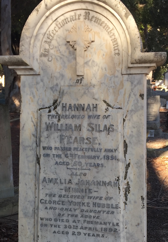 Silas married first Johanna, who is called Hannah on her tombstone, which is in Fremantle Cemetery. They had one child, Amelia, also known as Minnie, who married George Yorke Hubble 19 February 1890 in Johnston Memorial Congregational Church, (report here) and then died one year after her mother, in 1892. Silas married again the next year, 1893, to his cousin Alice (née Glyde), Edward Higham's widow.
