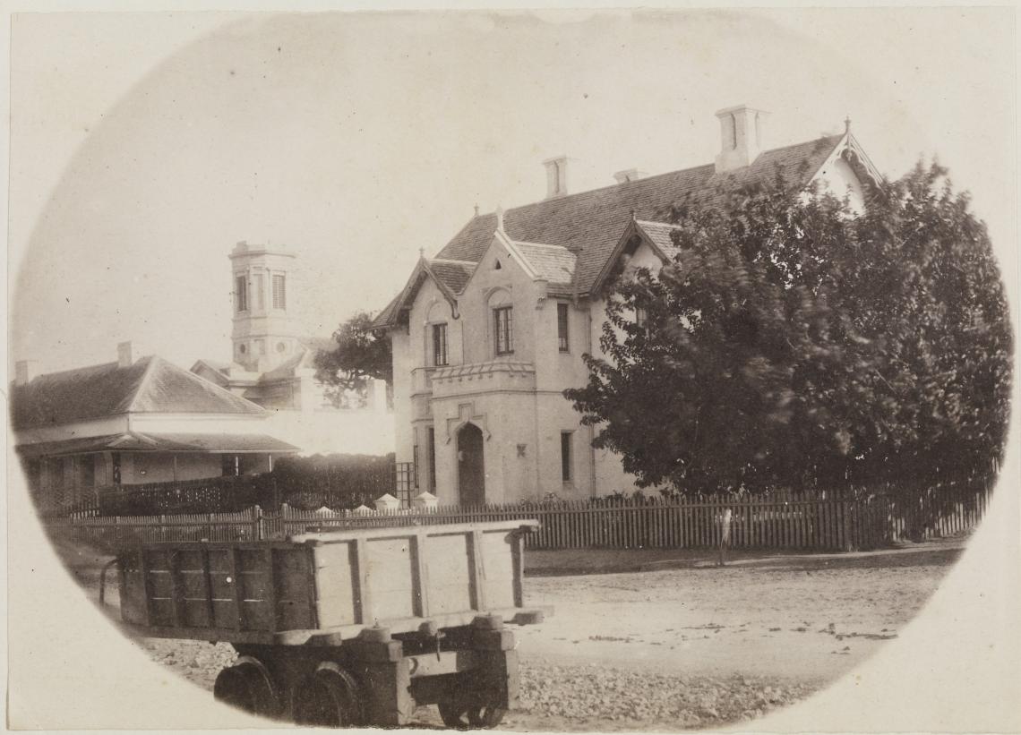 Alfred Stone's photograph, 1861-2, from SLWA. The Library's caption says that the building to the left is the original army barracks, designed by Henry Willey Reveley, and that the earlier St George's Church (demolished 1891) may be seen behind it. The main building is The Deanery.