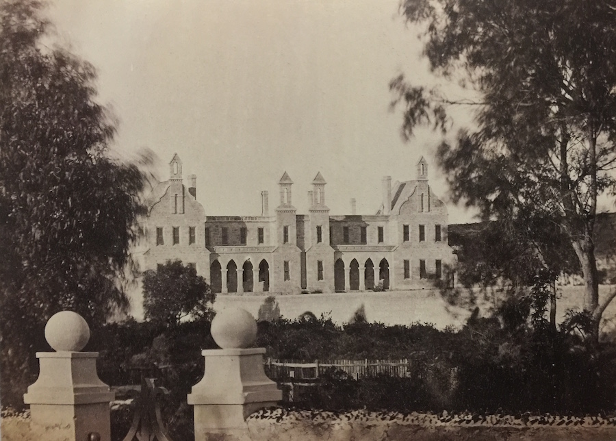 Image 3: Lunatic Asylum c1864, (photographer Stephen Stout, courtesy Chaney family) [Web editor's note: This photograph can be seen to much better advantage on a full page of John Dowson's 2003 book Old Fremantle: 85.] Dowson: Stephen Stout’s evocative image of the Fremantle Lunatic Asylum soon after its completion in 1861, an inspiring design giving credit to authorities for their attitude to mental health. The building survives today as an arts centre with its gables recently reinstated, but it suffers the indignity of a major road now running in front of its front steps.