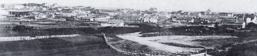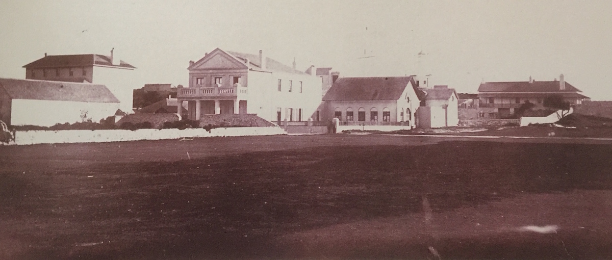 This is Alfred Stone's 1860s (c. 1865) photograph of the Green. (Click to see it in larger size.) The thin white line extending across the middle of the photo out to the right is Cliff St. All of the dark grassy area in the foreground is the Green. The building complex in the centre is George Shenton's house, with his stables on the right. Where the stables stood is now the site of the Dalgety building, where the MSC now has its offices, on the corner of Cliff and High Sts. Behind the Shenton buildings, to the right, is the Residency, which was demolished in 1967 for the railway line and a carpark. Hard to pick out in the photo at the rear, just to the right of the stables, is the first lighthouse. The three-storey house on the left was built by the first harbour master Daniel Scott in or after 1855.