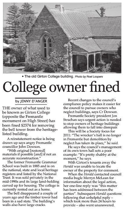 My sisters went to school at Girton College on High Street, opposite the Monument. In the 1880s it had been a boys boarding school, but when the English headmaster left it became a girls school with a co-ed kindergarten. It later was used as a church and is still standing. I went there with my sisters until I was seven. We would catch the tram from the West End. I remember playing the mornings and then sleeping in the afternoons at the house around the back. Miss Scott and Miss Lightly ran the school. Alec Smith 2004, 'The boy from the West End', in Karen Lang & Jan Newman, Wharf Rats and Other Stories: 100 Years of Growing up in Fremantle, FPS: 114.