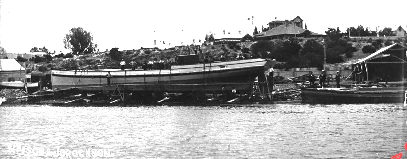 Looking SSE towards Tuckfield Street with the slip and boatyard near the foot of Tuckfield street. N T Jorgenson operated a slip and boat yard beside the traffic bridge at North Fremantle at this time. He also had an office at 31 Henry Street. 79 Tuckfield Street, 'Mutiara' is in the centre background and 77 just to its right. 'Riverview' is immediately behind it. 'Riverview' was erected in 1889 for Edward Mayhew, became a convent and school (Sacred Heart Ladies College) in 1902 and was demolished in 1953.